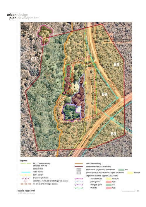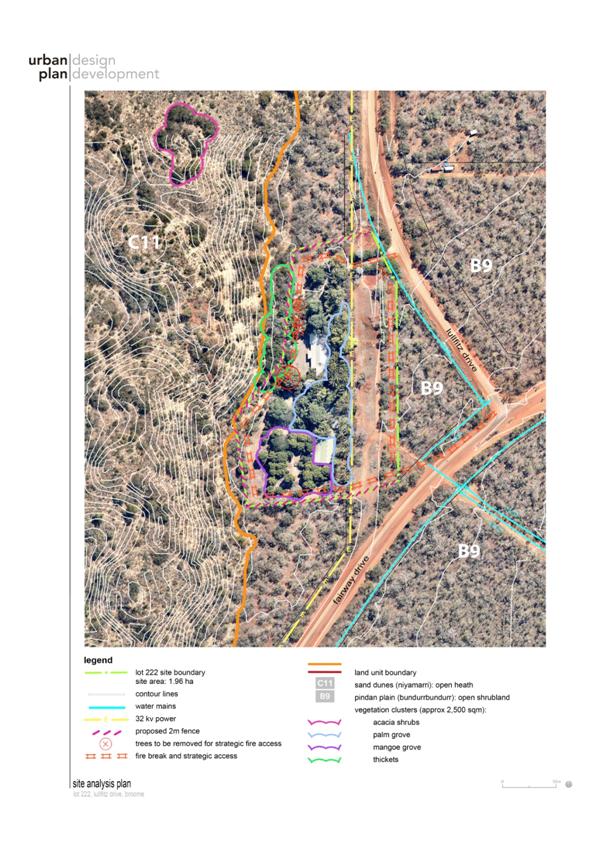 The site is on Pindan Soils, west of the Cable Beach coastal dunes, the confluence of which creates an interface for groundwater recharge significant. The surrounding contours grade from the west to east with stormwater drainage flowing south along the eastern boundary of the site.
