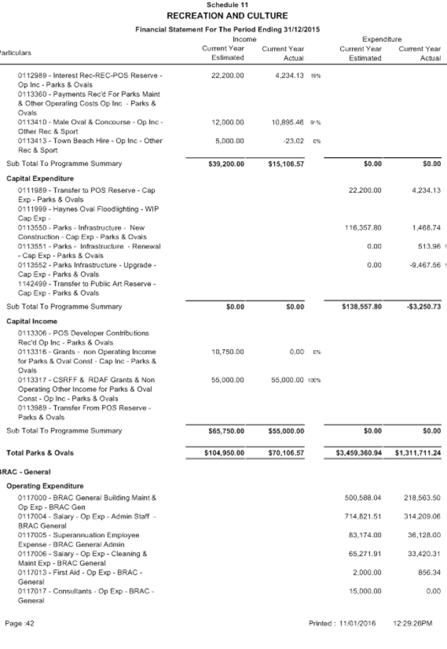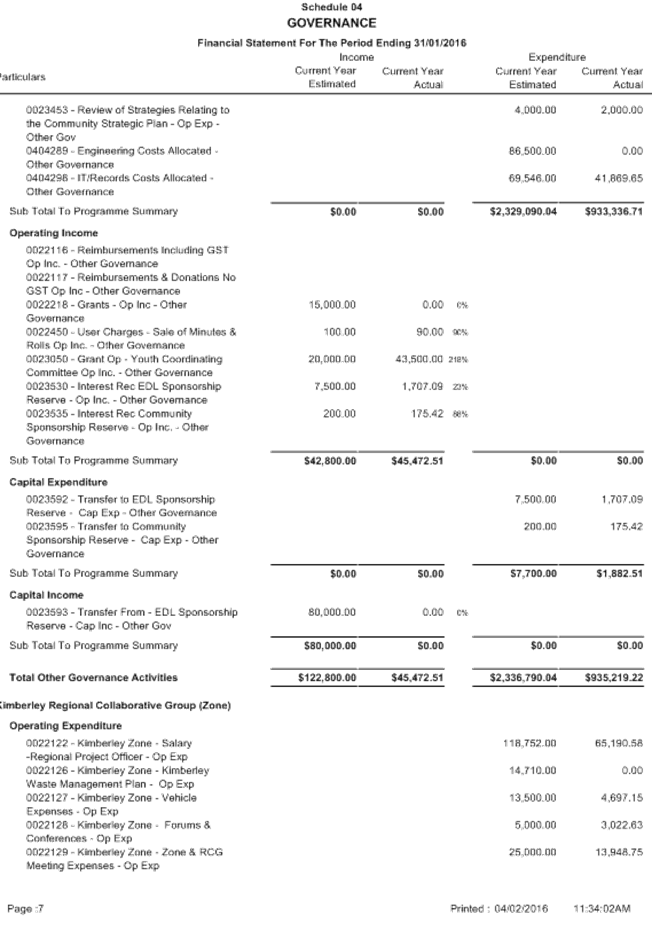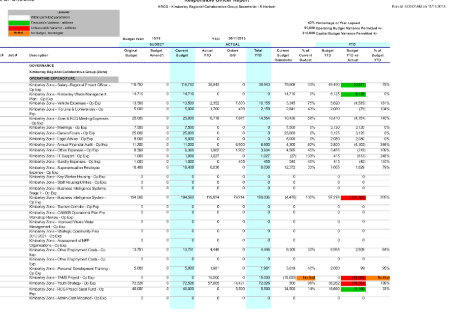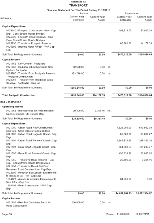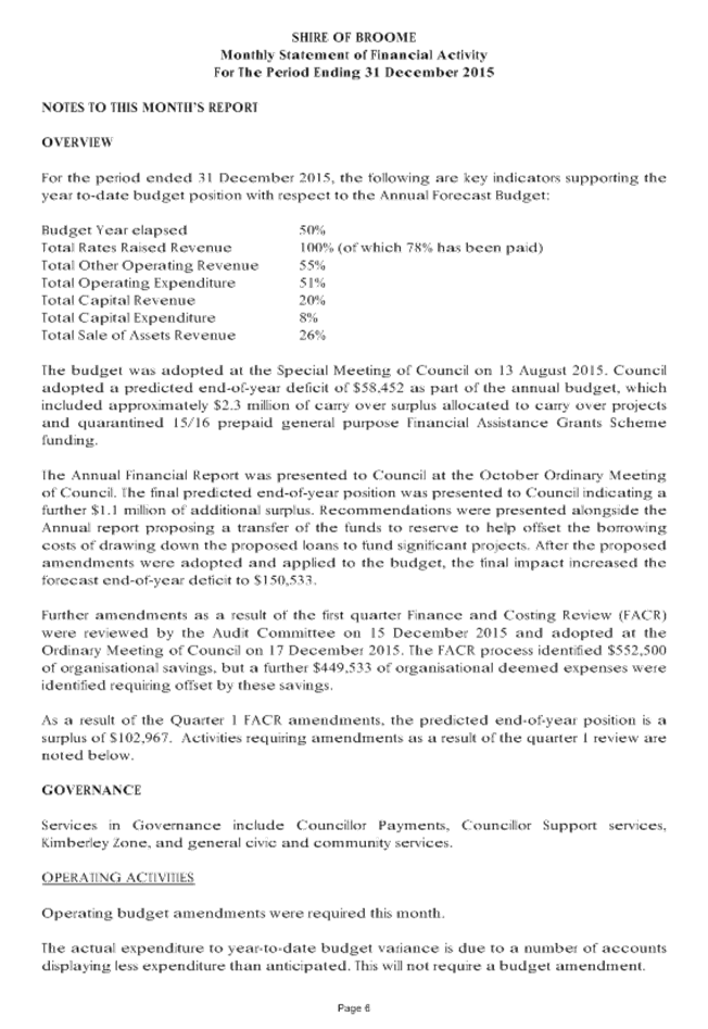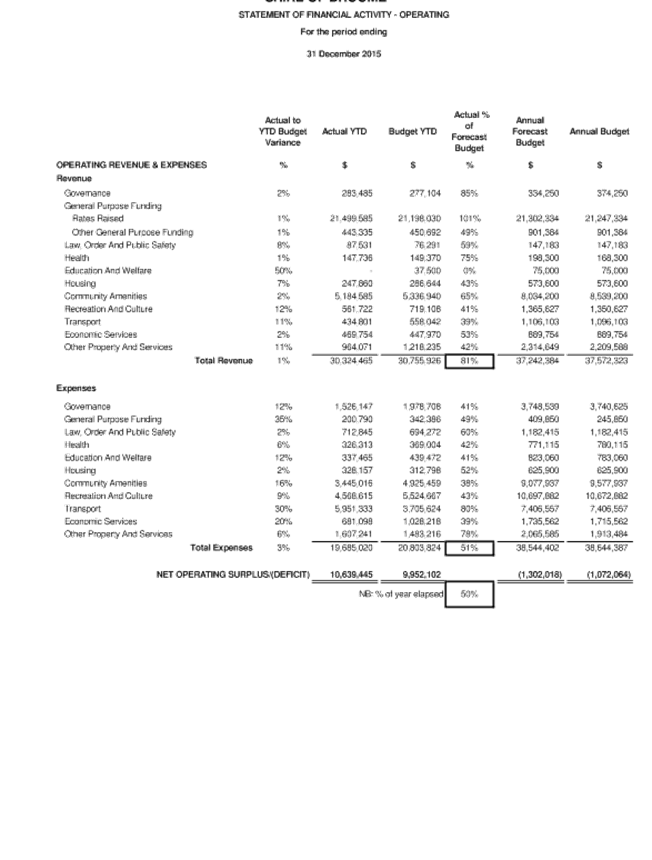 Between 1 January and 31 March, a local government is to carry out a review of its annual budget for that year and this is to be submitted to the Council within 30 days of completion. The terms of reference of the Audit Committee include a review of the half yearly financial results compared to budget from 1 July 2015 to 31 December 2015.