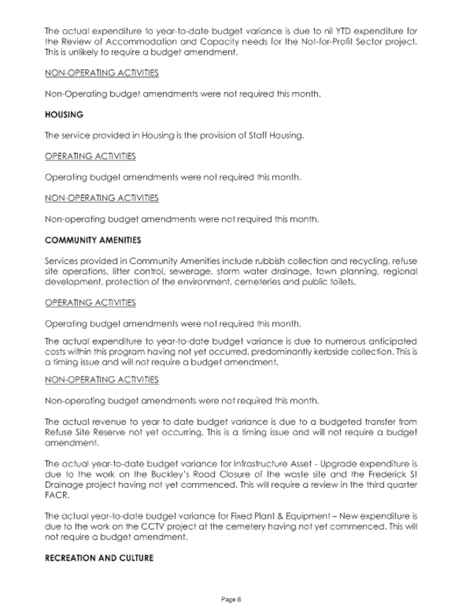 The Finance and Costings Review (FACR) is performed quarterly to provide a rolling forecast of the final end-of-year position to 30 June. Of these reviews, the 2nd quarter is a statutory review requiring report to the Department of Local Government and Communities highlighting the Shire’s forecast position against original budget. Contained within the report is information pertaining to the financial cost and delivery of strategic initiatives and key projects.