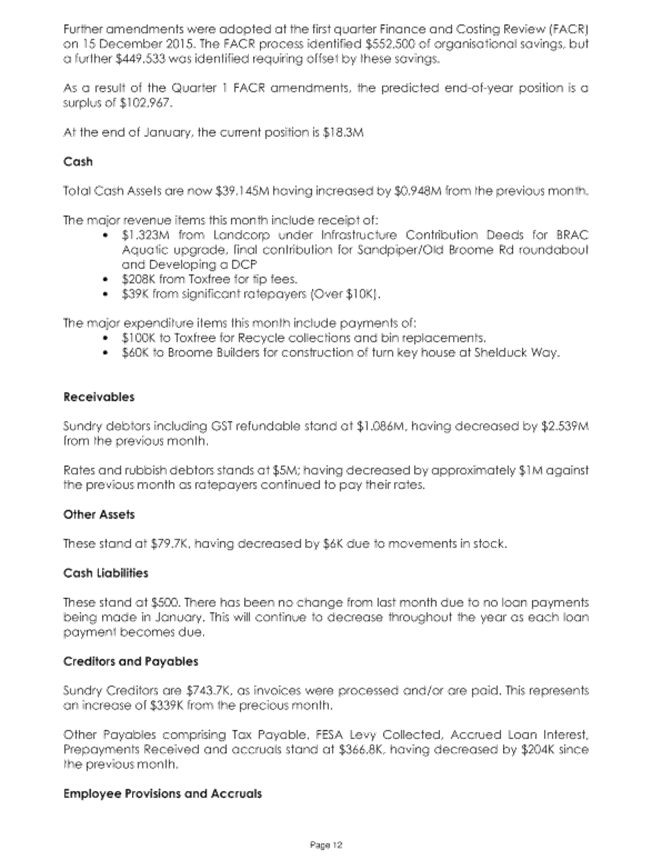 Council endorsed the results of the 1st Quarter FACR and adopted a $102,967 surplus position, after offsetting an original budgeted deficit of $58,453.