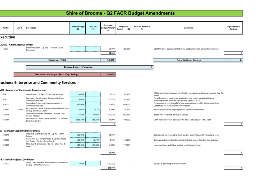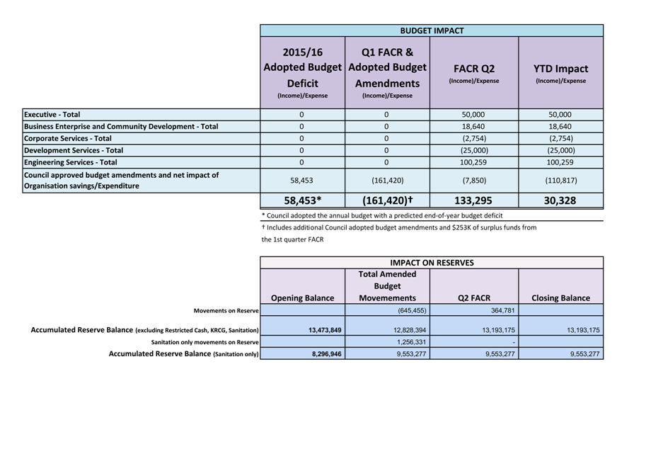 Following an extensive review process of income and expenditure to date, the 2nd Quarter FACR disclosed an estimated deficit of $133,295 for the quarter. The result of this FACR in addition to all previous budget amendments year-to-date will achieve a $30,328 deficit position.