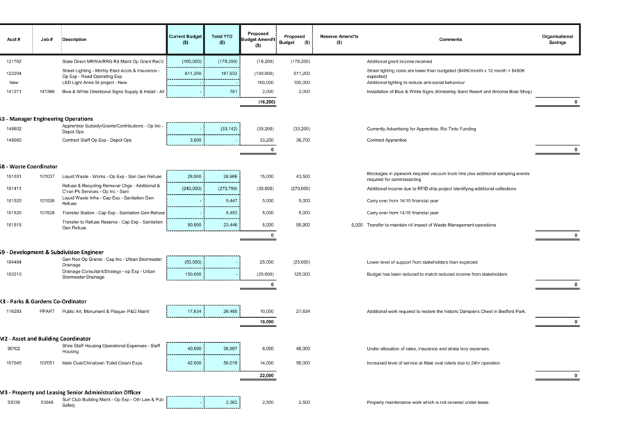 Council approved budget amendments and net impact of Organisation savings/Expenditure |