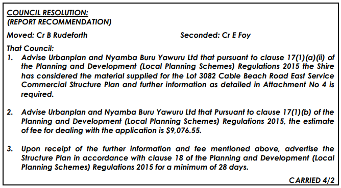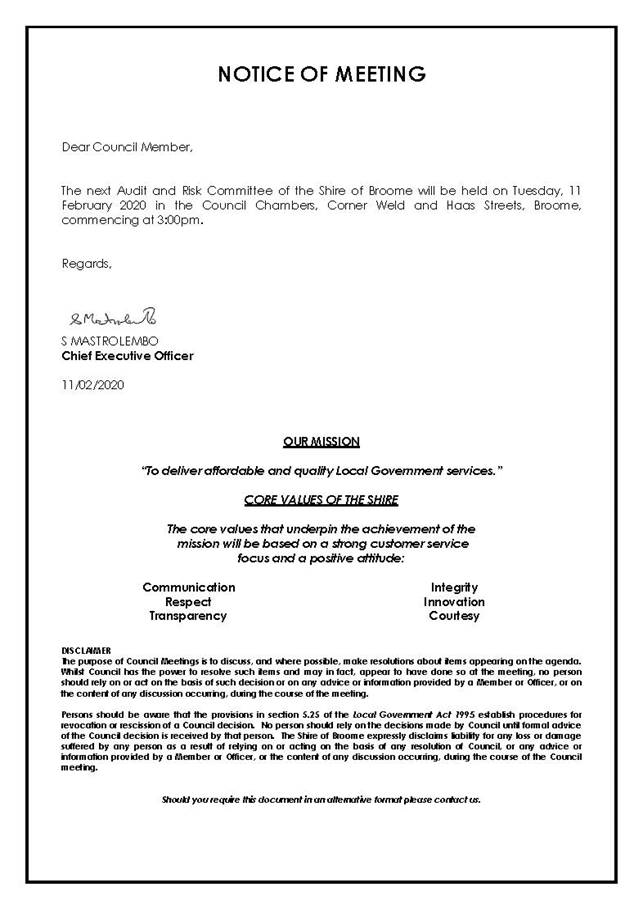Persons should be aware that the provisions in section 5.25 of the Local Government Act 1995 establish procedures for revocation or rescission of a Council decision. No person should rely on the decisions made by Council until formal advice of the Council decision is received by that person. The Shire of Broome expressly disclaims liability for any loss or damage suffered by any person as a result of relying on or acting on the basis of any resolution of Council, or any advice or information provided by a Member or Officer, or the content of any discussion occurring, during the course of the Council meeting.