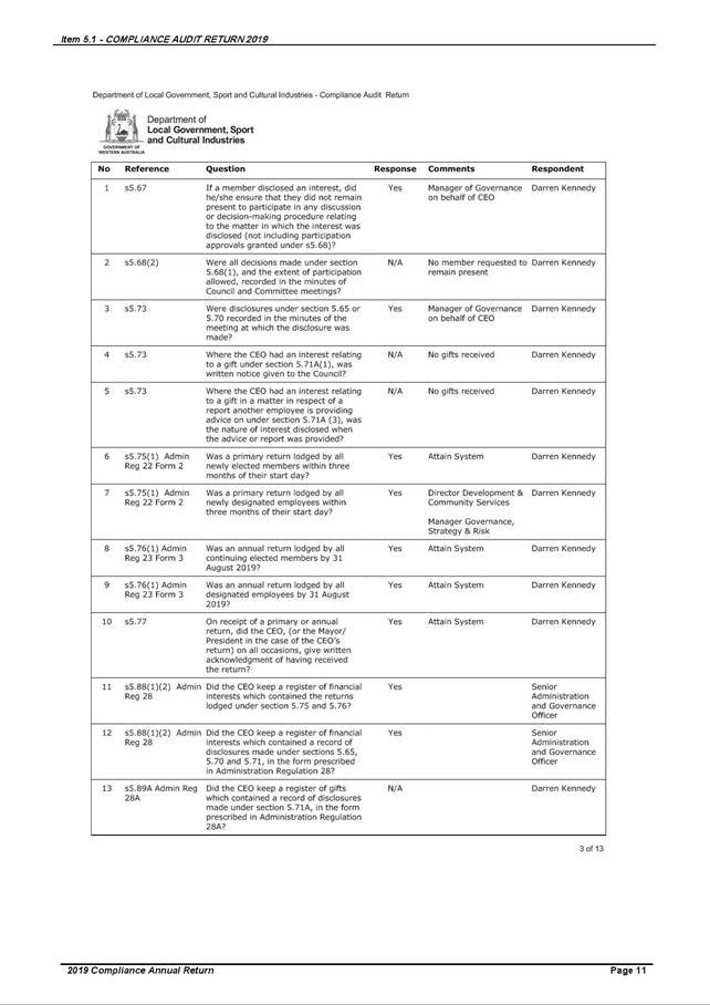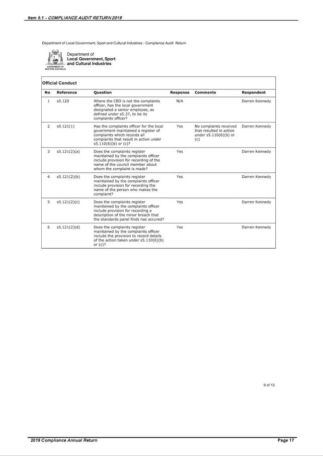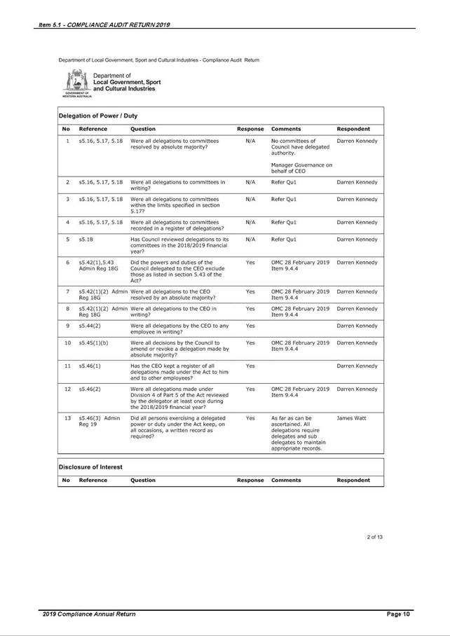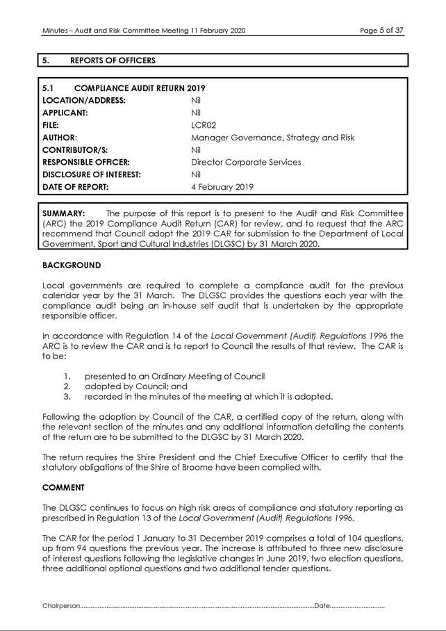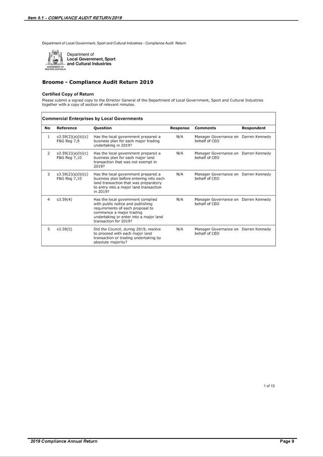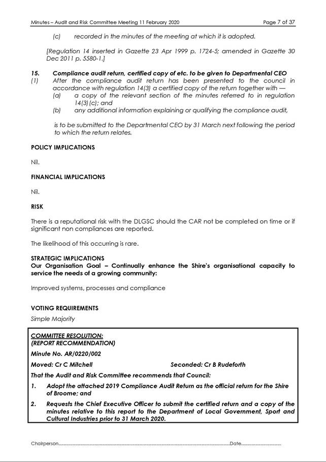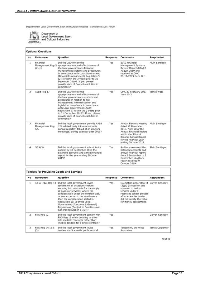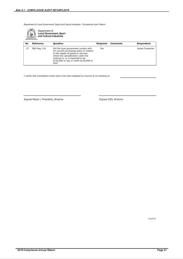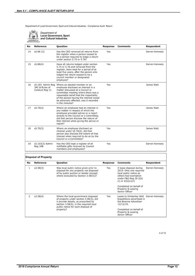 Minute No. C/0220/028 Moved: Cr D Male Seconded: Cr C Mitchell That Council: 1. Adopt the attached 2019 Compliance Audit Return as the official return for the Shire of Broome; and 2. Requests the Chief Executive Officer to submit the certified return and a copy of the minutes relative to this report to the Department of Local Government, Sport and Cultural Industries prior to 31 March 2020. |