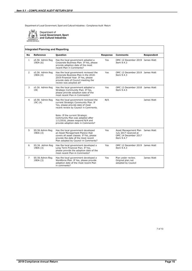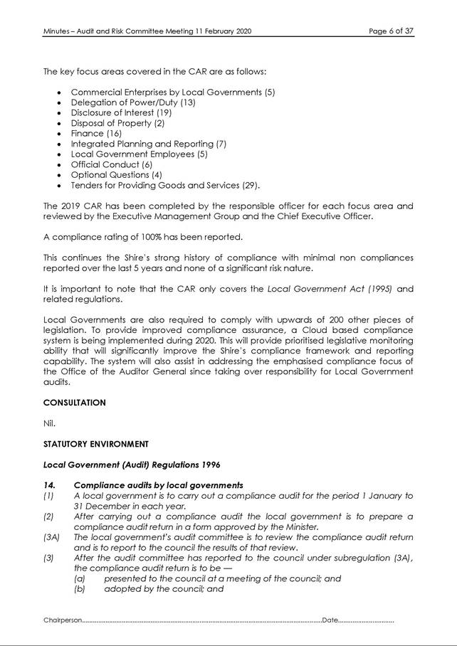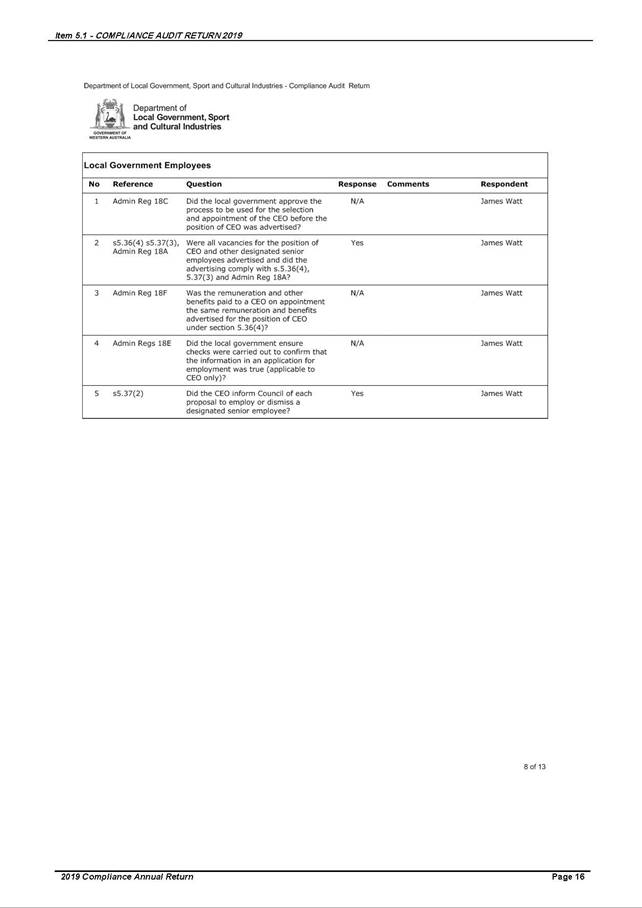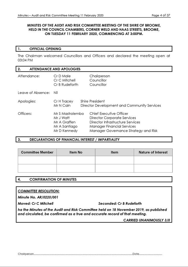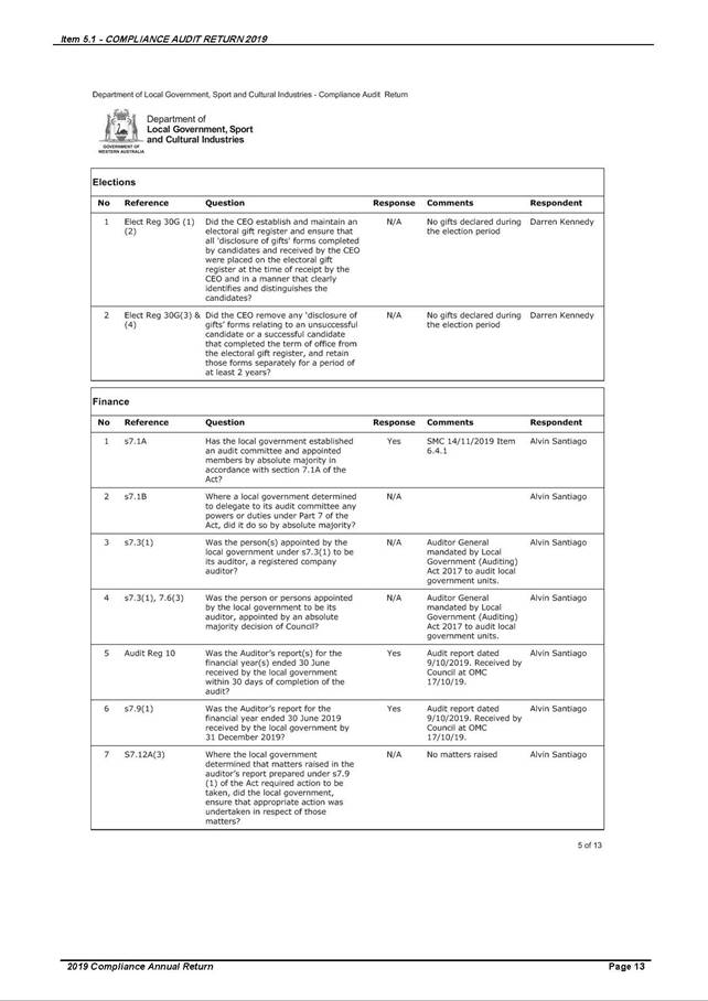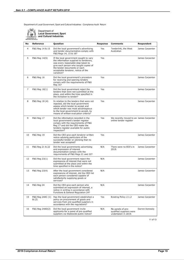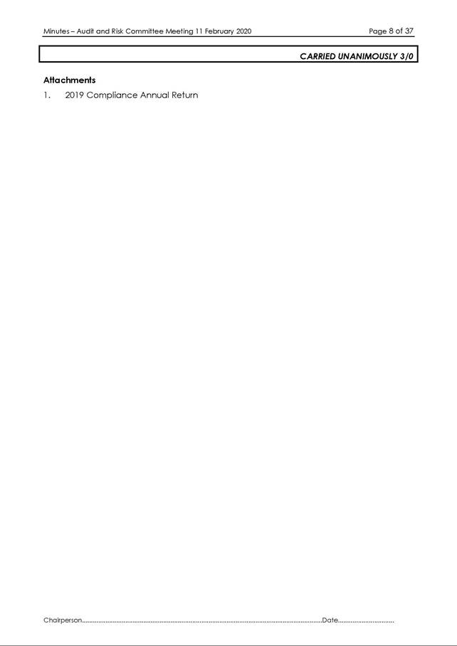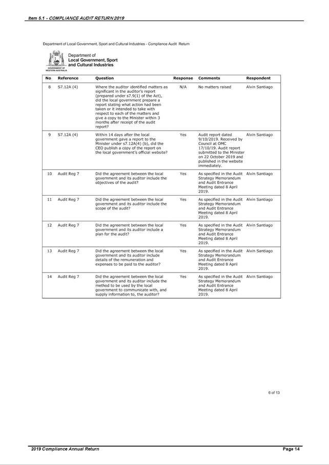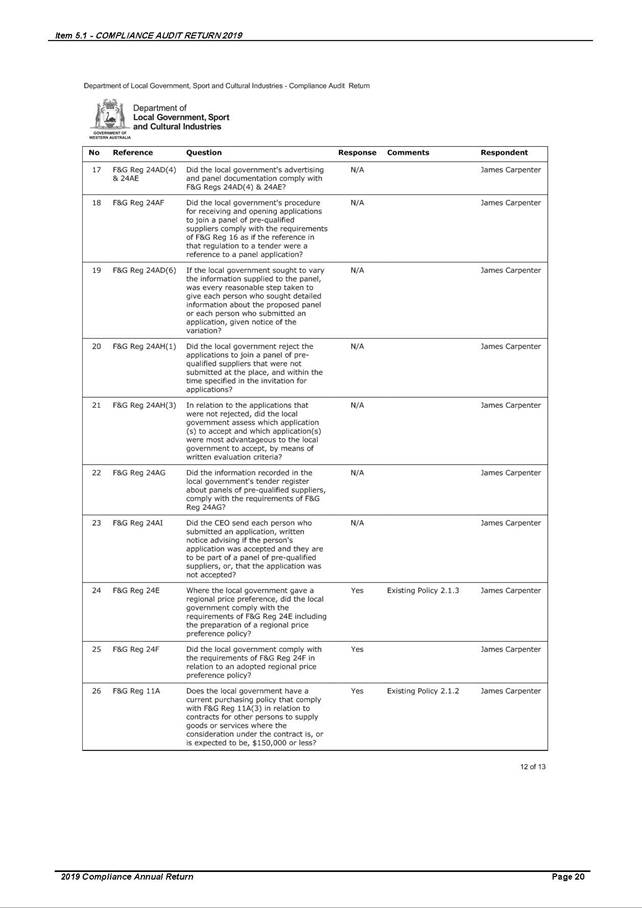 Minute No. C/0220/028 Moved: Cr D Male Seconded: Cr C Mitchell That Council: 1. Adopt the attached 2019 Compliance Audit Return as the official return for the Shire of Broome; and 2. Requests the Chief Executive Officer to submit the certified return and a copy of the minutes relative to this report to the Department of Local Government, Sport and Cultural Industries prior to 31 March 2020. |