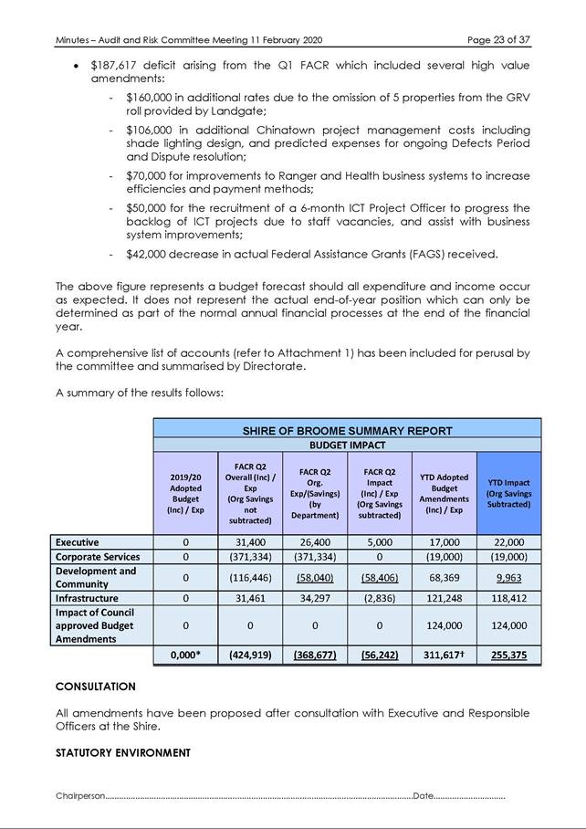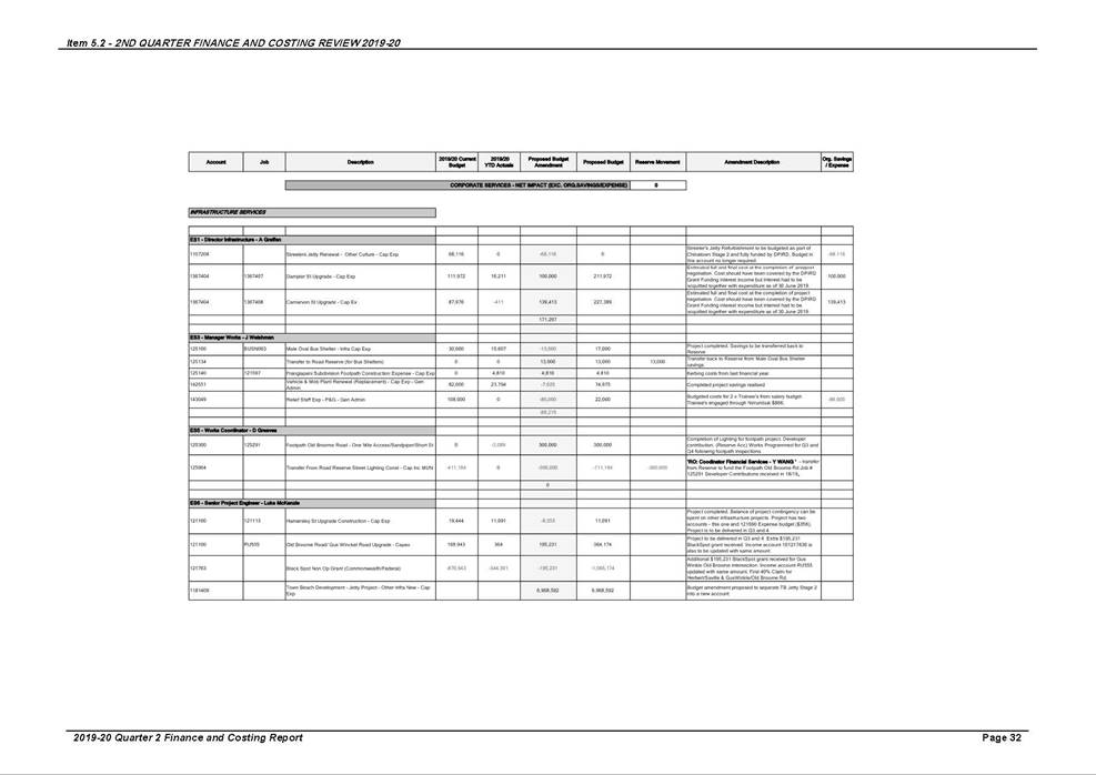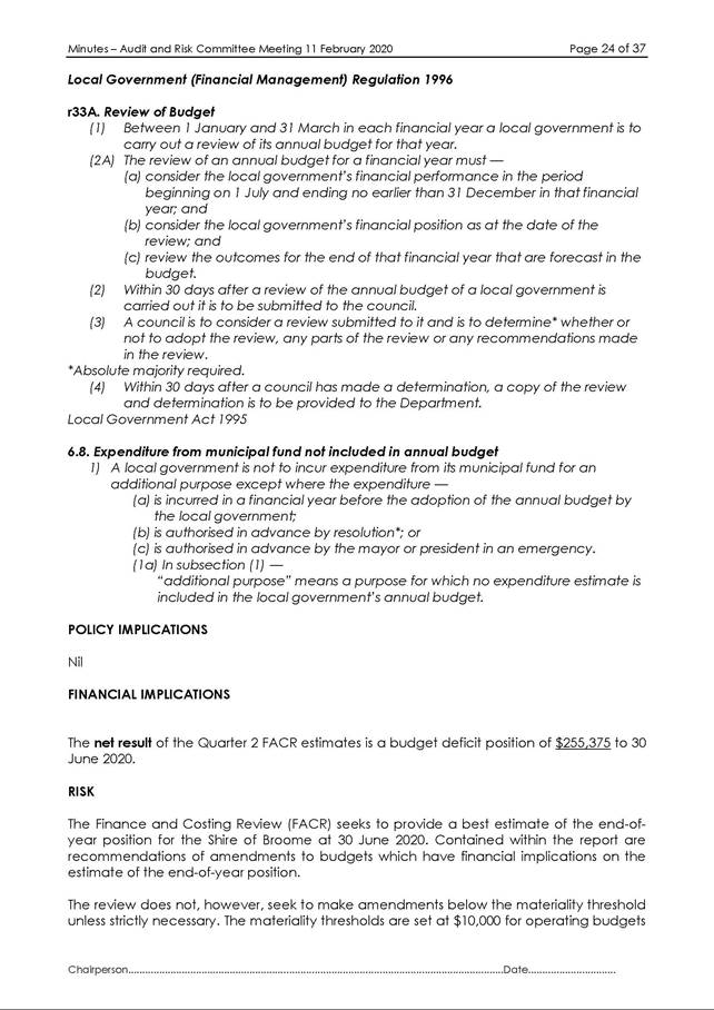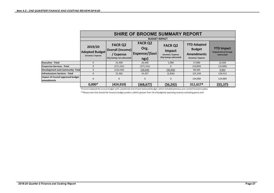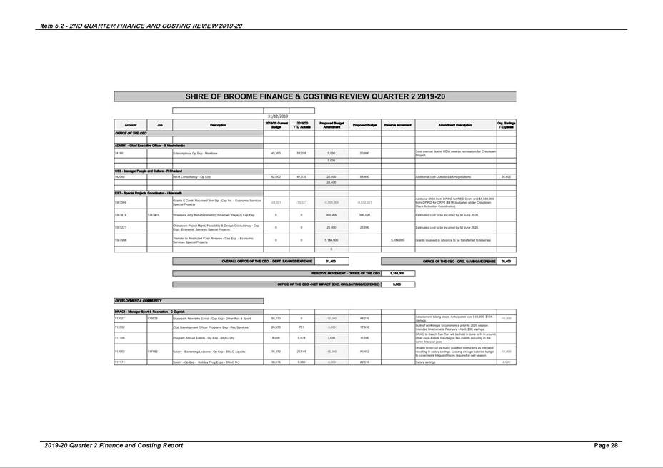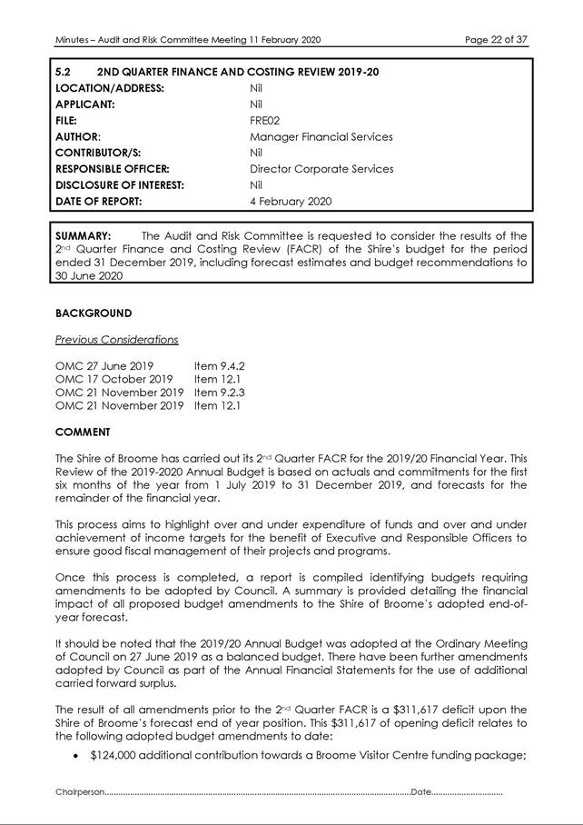 The Finance and Costing Review (FACR) seeks to provide a best estimate of the end-of-year position for the Shire of Broome at 30 June 2020. Contained within the report are recommendations of amendments to budgets which have financial implications on the estimate of the end-of-year position.