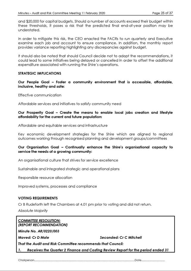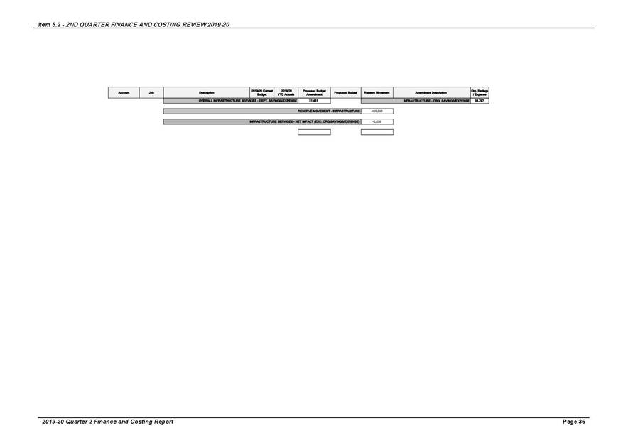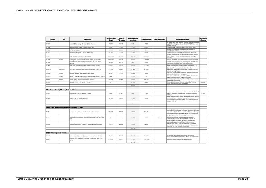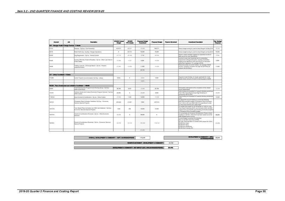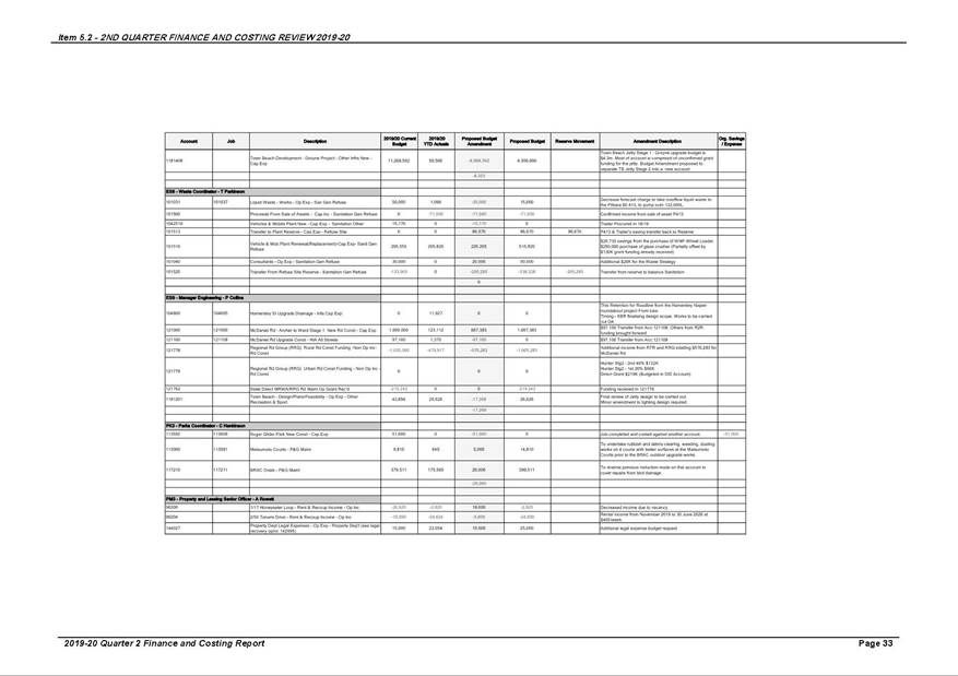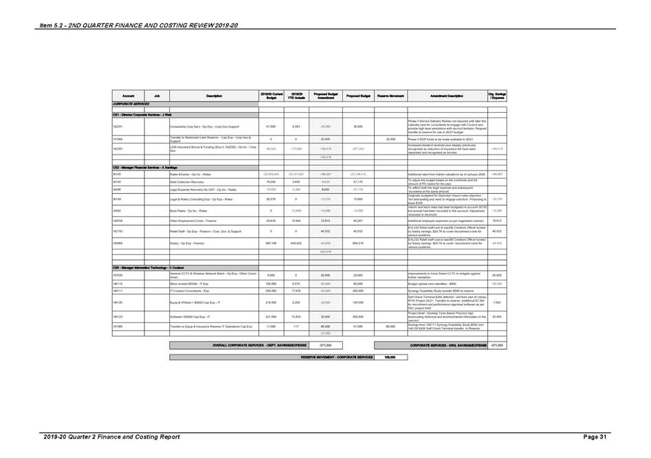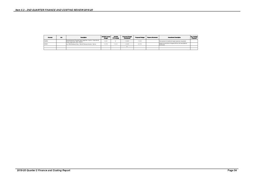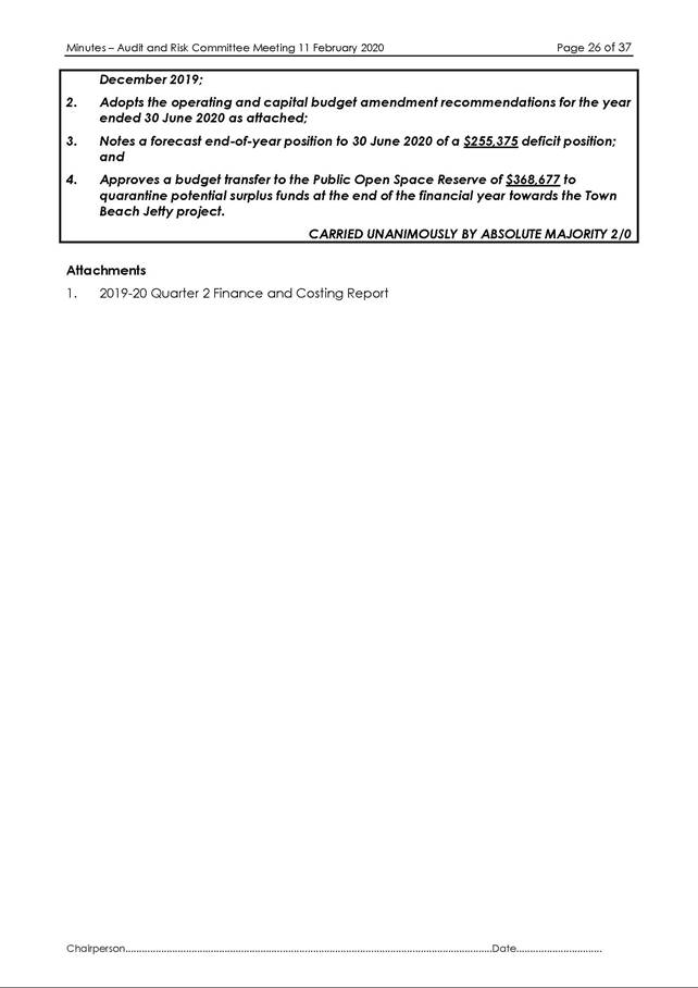 Minute No. C/0220/029 Moved: Cr D Male Seconded: Cr C Mitchell That Council: 1. Receives the Quarter 2 Finance and Costing Review Report for the period ended 31 December 2019; 2. Adopts the operating and capital budget amendment recommendations for the year ended 30 June 2020 as attached; 3. Notes a forecast end-of-year position to 30 June 2020 of a $255,375 deficit position; and 4. Approves a budget transfer to the Public Open Space Reserve of $368,677 to quarantine potential surplus funds at the end of the financial year towards the Town Beach Jetty project. |